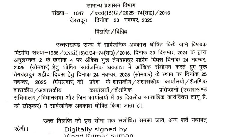 संशोधित तिथि के अनुसार गुरु तेग बहादुर शहीद दिवस का अवकाश प्रदेश के सभी शासकीय व अशासकीय कार्यालयों, शिक्षण संस्थानों, सचिवालय, विधानसभा एवं पांच-दिवसीय कार्य प्रणाली वाले प्रतिष्ठानों में लागू रहेगा (उत्तराखंड को छोड़कर)।शासन ने यह भी स्पष्ट किया है कि आदेश की अन्य सभी शर्तें यथावत रहेंगी। यह संशोधित अधिसूचना सचिव विनोद कुमार सुमन के डिजिटल हस्ताक्षर से जारी की गई है।