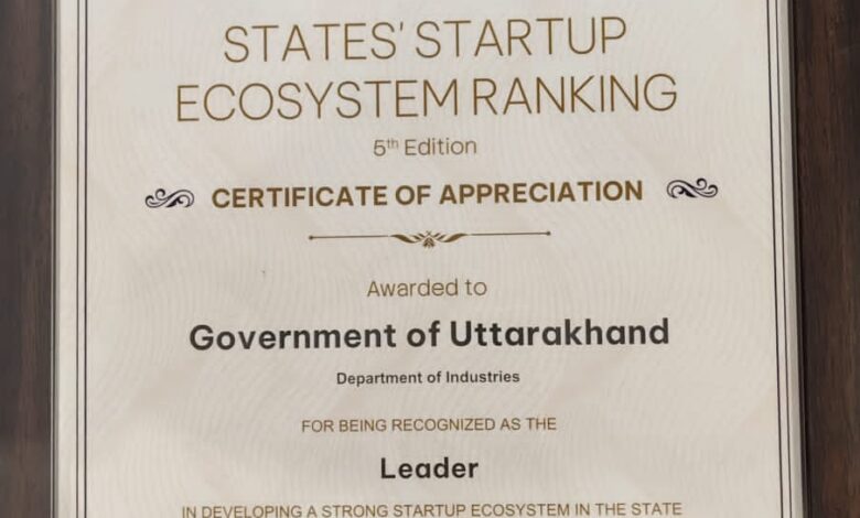 भारत सरकार के वाणिज्य एवं उद्योग मंत्रालय के अंतर्गत उद्योग संवर्धन एवं आंतरिक व्यापार विभाग (DPIIT) द्वारा जारी States’ Startup Ecosystem Ranking (5वां संस्करण) में उत्तराखण्ड को मजबूत स्टार्टअप इकोसिस्टम विकसित करने में ‘लीडर’ के रूप में मान्यता प्रदान की गई है। इस उपलब्धि के लिए राष्ट्रीय स्टार्टअप दिवस के अवसर पर उत्तराखण्ड सरकार के उद्योग विभाग को Certificate of Appreciation प्रदान किया गया।