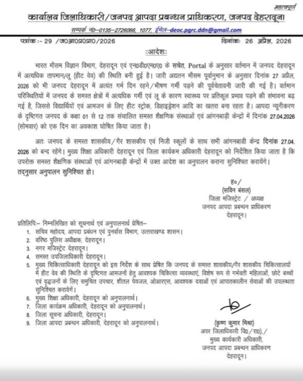 अतः जनपद के समस्त शासकीय / गैर शासकीय एवं निजी स्कूलों के साथ सभी आंगनबाडी केन्द्र 27.04. 2026 को बन्द रहेंगे। मुख्य शिक्षा अधिकारी देहरादून एवं जिला कार्यकम अधिकारी देहरादून को निर्देशित किया जाता है कि उपरोक्त समस्त शैक्षणिक संस्थाओं एवं आंगनबाड़ी केन्द्रों में उक्त आदेश का अनुपालन कराना सुनिश्चित करायेंगे। तद्नुसार अनुपालन सुनिश्चित हो।